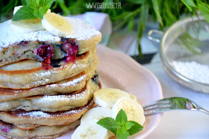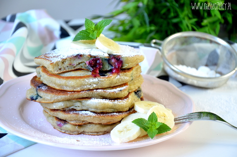 Dziś mam dla Was pyszną propozycję na śniadanie. Trochę pozmieniałam przepis na amerykańskie pancake’i zastępując niektóre składniki, po które nie miałam ochoty specjalnie biec do sklepu i dorzucając nieco owoców :) Wszystko wskazuje na to, że takie kulinarne eksperymenty popłacają – przynajmniej w przypadku dzisiejszych bananowych placuszków z borówkami.
