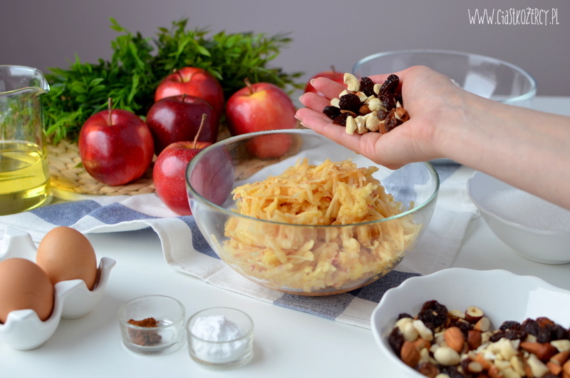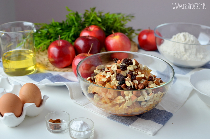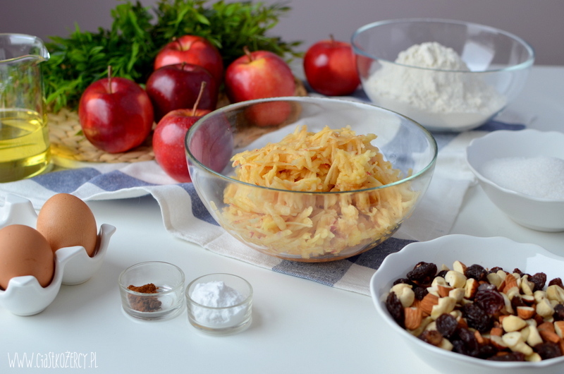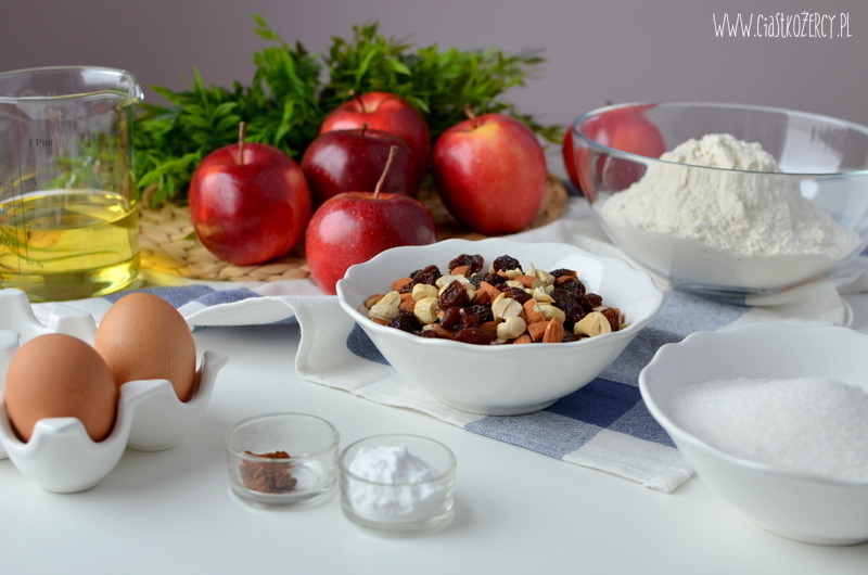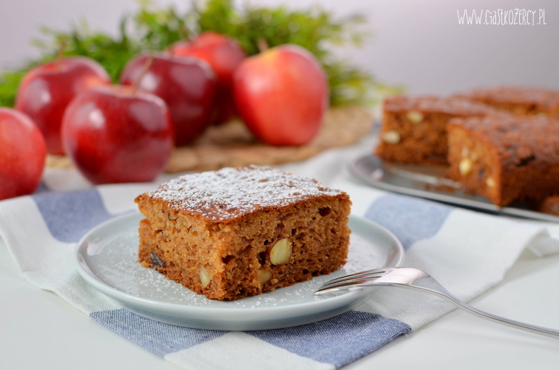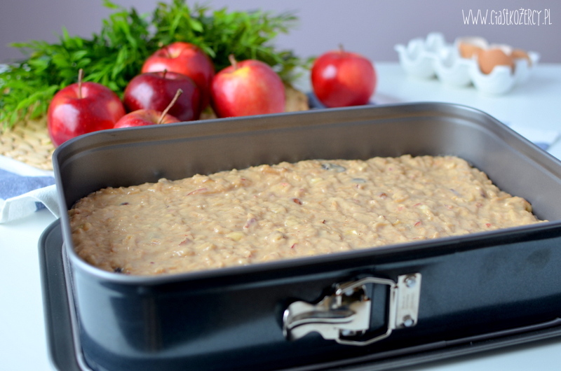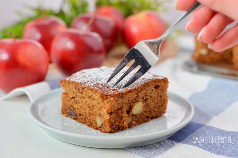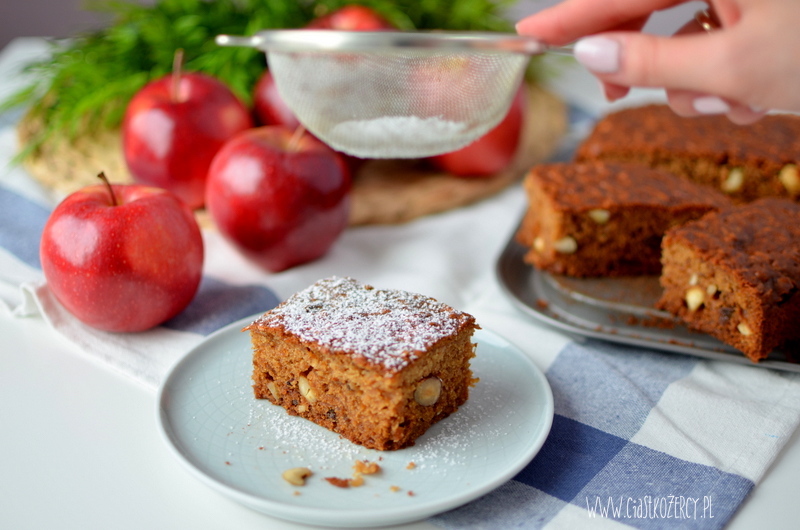 Dzisiejsze ciasto jabłkowe przygotujecie zaledwie z kilku składników, jest wilgotne, zbite, aromatyczne i mocno jabłkowe. Przypomina mi nieco ciasto marchewkowe. Możecie dodać dowolne ulubione bakalie i przyprawy, żeby smakowała tym co lubicie. Piekła je moja mama z jabłek, które zbieraliśmy w ogrodzie u mojej Babci, a przepis dostaliśmy od naszej sąsiadki – pani Małgosi. Ze wszystkich przetworów, dżemów czy kompotów, to właśnie ciasto było moim ulubionym sposobem na wykorzystanie tych wszystkich owoców. Dzisiejsze ciasto jabłkowe piekłam w prostokątnej blaszce o wymiarach 35×24 cm.