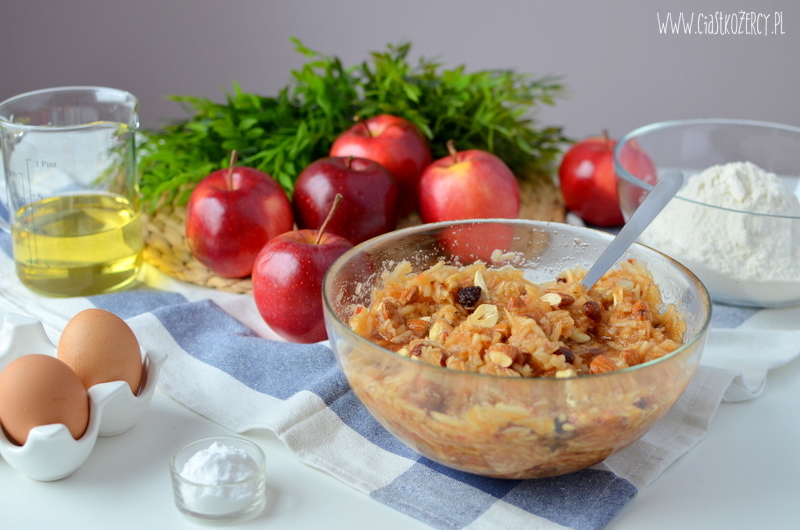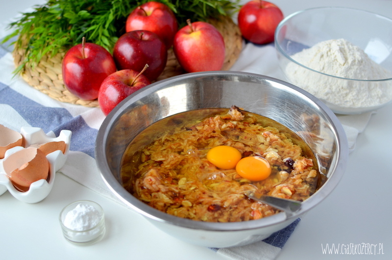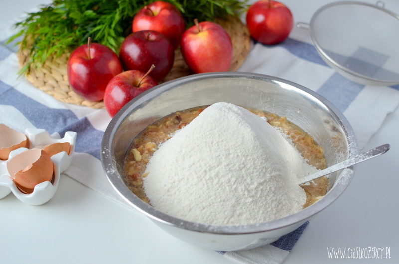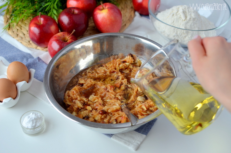 Do jabłek dodajemy mokre składniki: olej i jajka. Mieszamy do połączenia. Dodajemy mąkę i sodę oczyszczoną i jeszcze raz mieszamy całość.