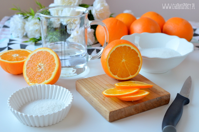 3 pomarańcze dokładnie myjemy i kroimy na cienkie plasterki. W garnku mieszamy wodę z cukrem, dodajemy pokrojone pomarańcze i gotujemy na małym ogniu tak długo, aż pomarańcze zrobią się lekko przezroczyste, mnie zajęło to ok. 20 minut, w tym czasie można już zacząć przygotowywać ciasto. Odstawiamy do przestudzenia.