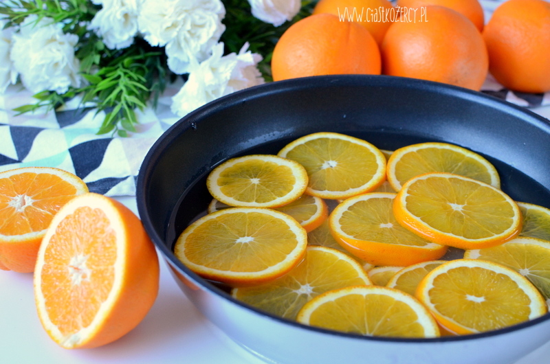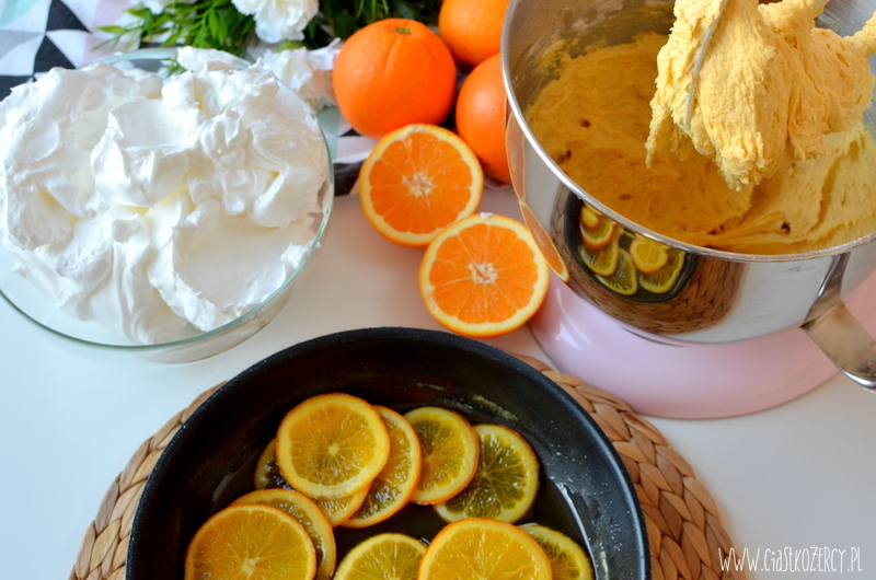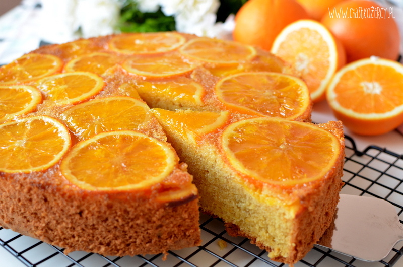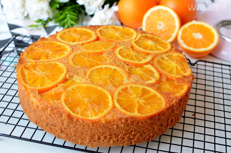 Przepis na ciasto pomarańczowe przyszedł mi do głowy, kiedy po latach upiekłam cytryniaka mojej mamy. Postanowiłam nieco go zmodyfikować i zrobić w wersji „do góry nogami”, gdzie ciasto podaje się odwrotnie niż było pieczone. Dzięki temu przy niewielkim wysiłku możemy zrobić piękną dekorację z plasterków pomarańczy :) Ciasto piekłam w dużej tortownicy o średnicy 26 cm.