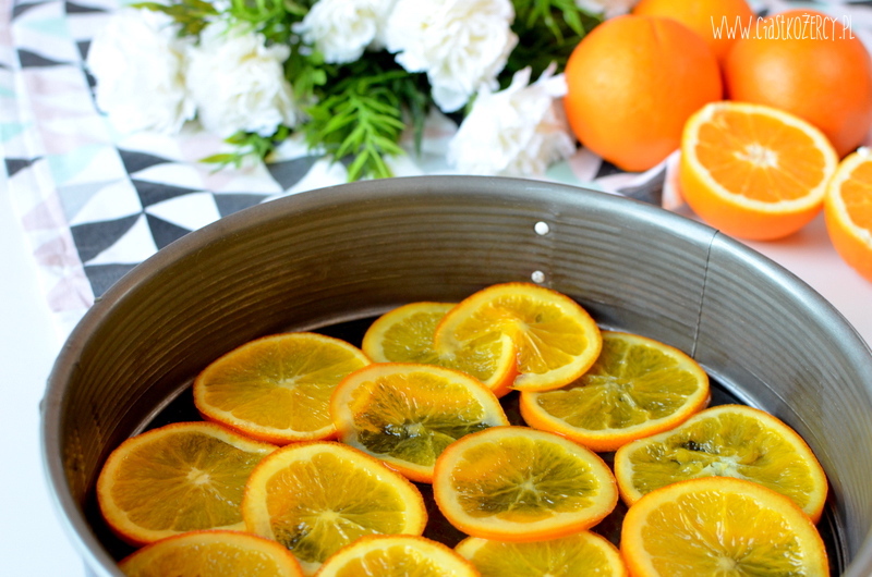 Na dno dużej tortownicy układamy przygotowane wcześniej plasterki pomarańczy (nie wylewamy syropu, w którym się gotowały!).