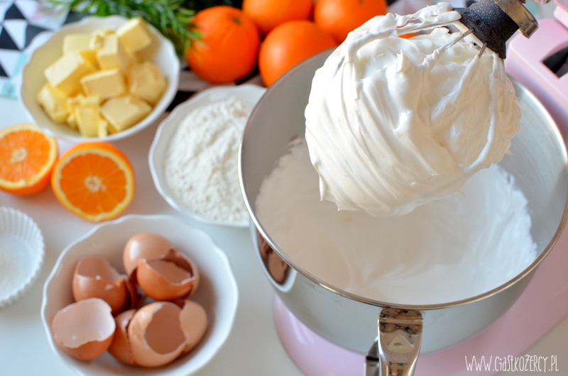 Ubitą pianę odstawiamy na później. W mikserze ucieramy razem margarynę z pozostałym cukrem, dodajemy po jednym żółtka i dalej ucieramy. Dodajemy skórkę otartą z 2 pomarańczy i sok z 1 (z 1,5 jeśli pomarańcze były małe). Na tym etapie masa nie jest jednolita i może być widać małe grudki margaryny, nie należy się tym przejmować.