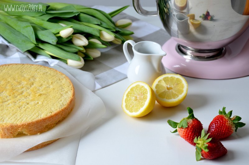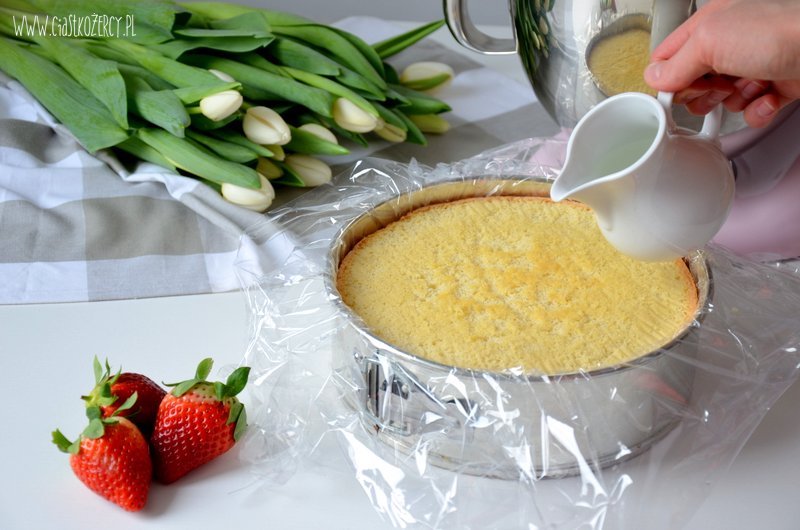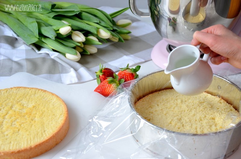 Pierwszy z blatów wkładamy do foremki i nasączamy ponczem z wody i cytryny. Jeśli ciasta nie będą jadły dzieci dodatkowo można dodać alkohol – nalewkę lub białe wino. Zdecydowanie nie polecam już jednak dosładzać ponczu – biszkopty są dosyć słodkie.