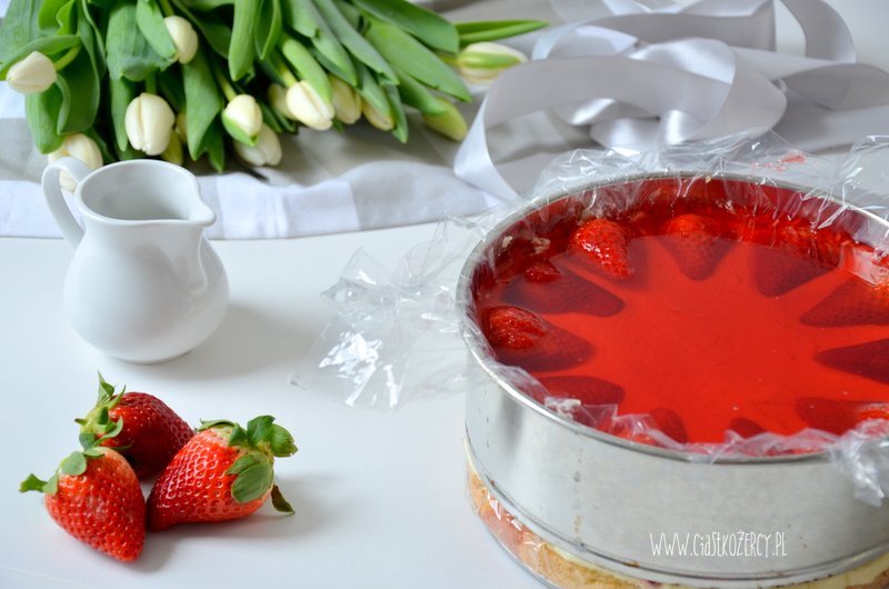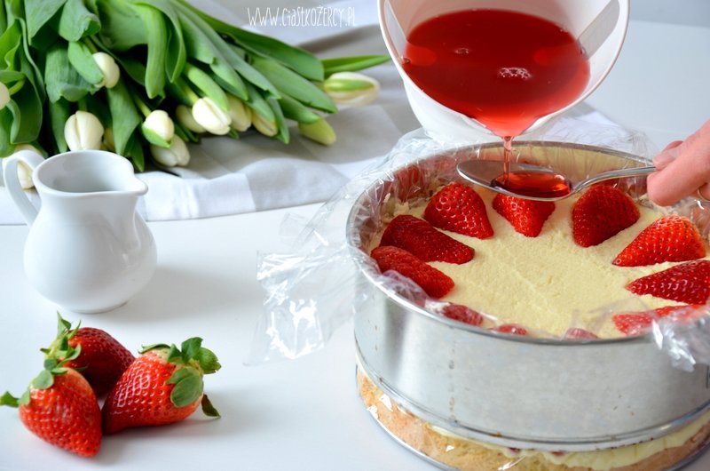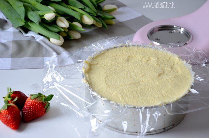Jeśli tak jak u mnie wasza foremka po nałożeniu biszkoptów i kremu wyda się nieco za niska można, ściągnąć obręcz i przepiąć ją nieco wyżej (tu także przydaje się zostawiona wcześniej folia). Galaretkę rozpuszczamy w 1 litrze wody (zamiast 1,5) i kiedy przestygnie wylewamy ją na dobrze schłodzone ciasto. Wstawiamy do lodówki do stężenia.