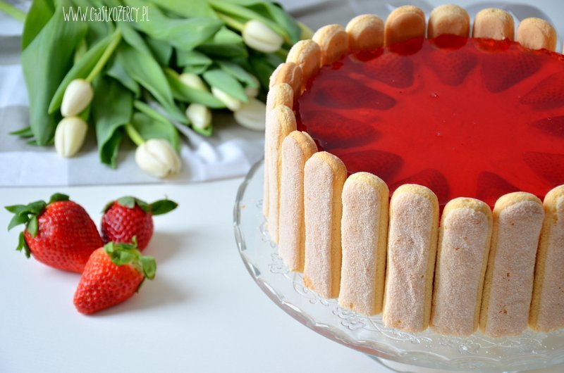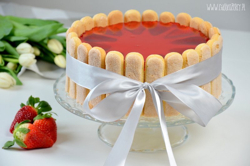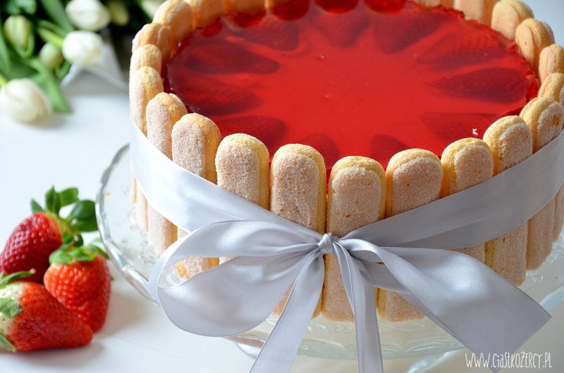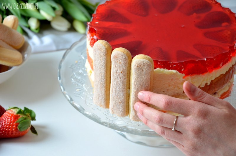 Kiedy galaretka stężeje wyciągamy ciasto z formy i dekorujemy biszkoptami – tu przyda się resztka kremu, jeśli jakiś biszkopt nie będzie się trzymał przyklejamy go na krem.