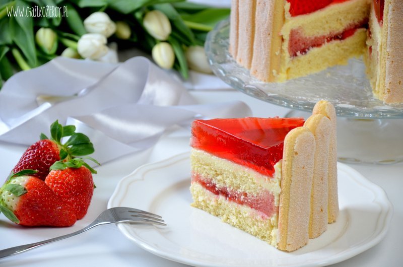 Klasyk niedzielnych deserów, obowiązkowa pozycja na wszystkich moich dziecięcych przyjęciach urodzinowych. Najprostsze ciasto świata a przy tym takie dobre! Chodzi oczywiście o ciasto z galaretką :) Dziś proponuję Wam go w odświętnej odsłonie: domowy biszkopt pieczony w okrągłej blaszce i obłożony biszkoptami prezentuje się naprawdę elegancko. A przy tym dalej nie wymaga dużo pracy. Do upieczenia biszkoptu wykorzystałam foremkę o średnicy 20 cm.