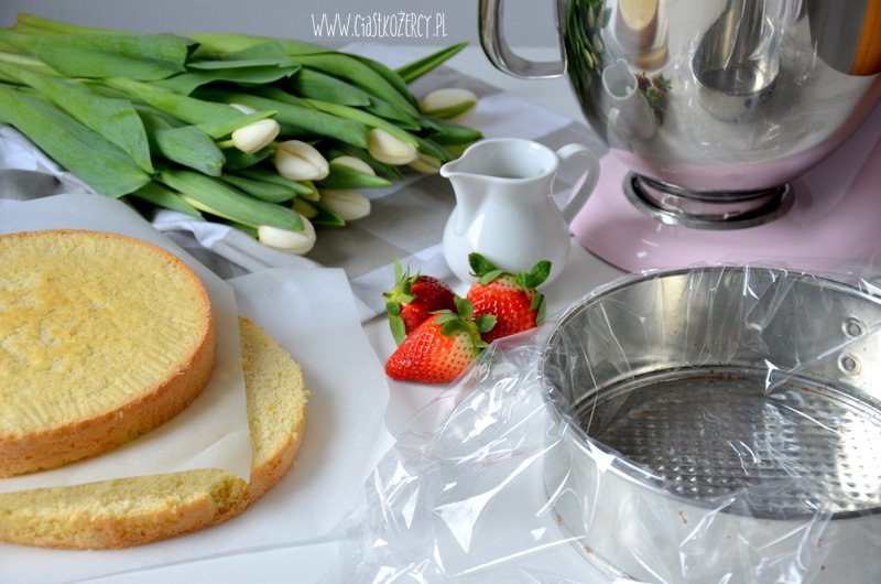 Foremkę, w której piekliśmy biszkopt wykładamy folią spożywczą – dzięki temu łatwiej będzie wyciągnąć gotowe ciasto, zabezpieczy je także przed ewentualnymi przeciekami galaretki ;) Biszkopt przekrawamy na dwa blaty.