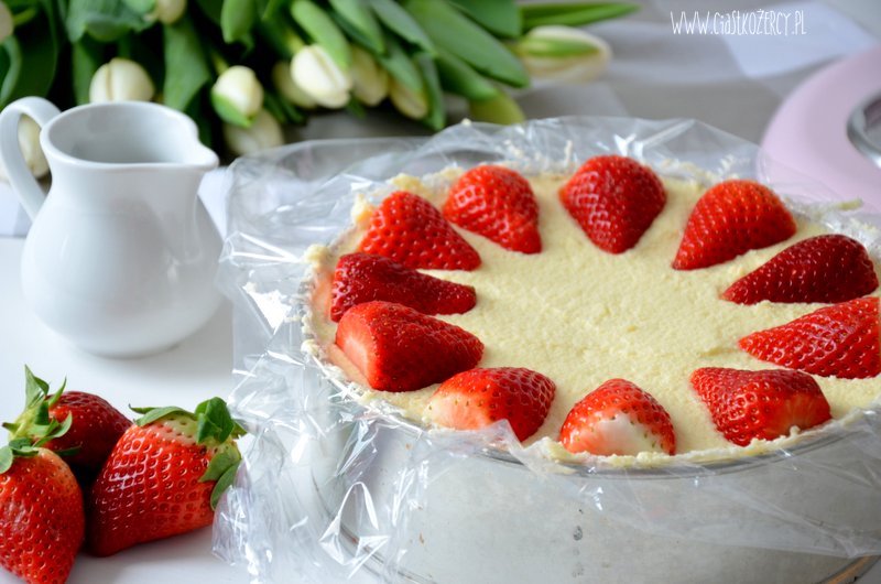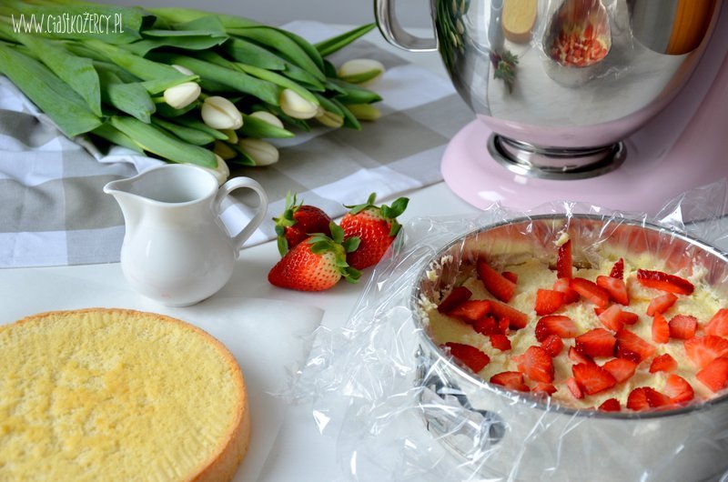 Na pierwszy blat wykładamy ok. połowę kremu i rozprowadzamy. Posypujemy pokrojonymi na kawałki truskawkami.