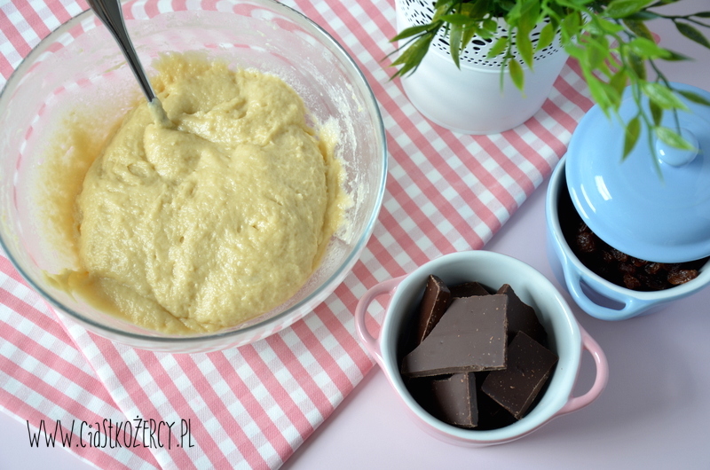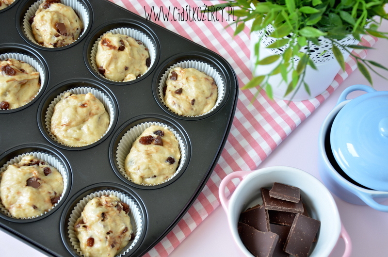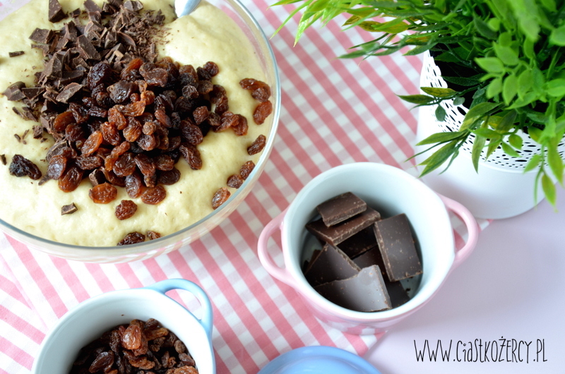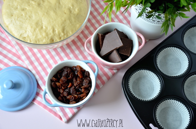 Do wyrośniętego ciasta dodajemy pokrojoną na kawałki czekoladę i rodzynki. Mieszamy i przekładamy do blaszki wyłożonej papierowymi papilotkami. Jeśli macie czas jeszcze raz zostawić babeczki do wyrośnięcia – to wspaniale, będą jeszcze bardziej puszyste! Ja czasem piekę je bez drugiego wyrastania i też są ok.
