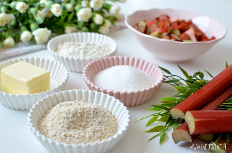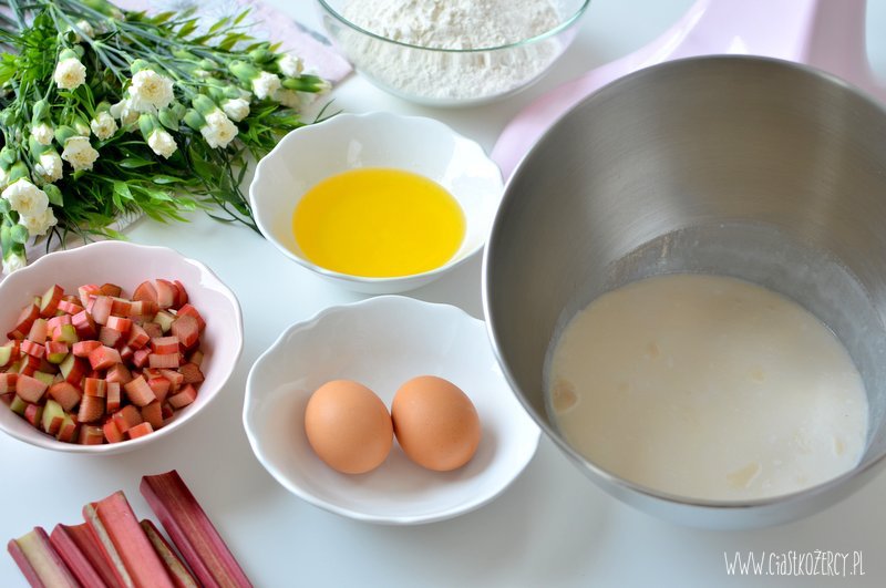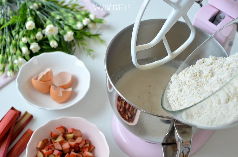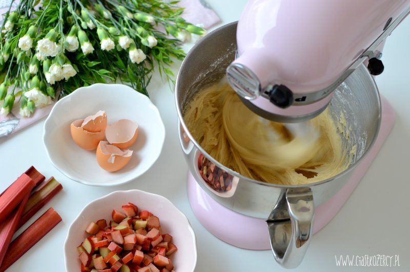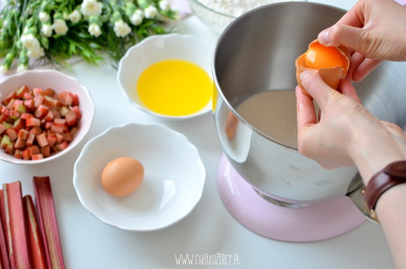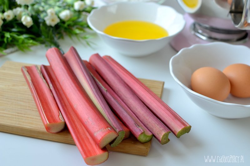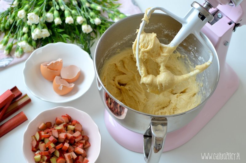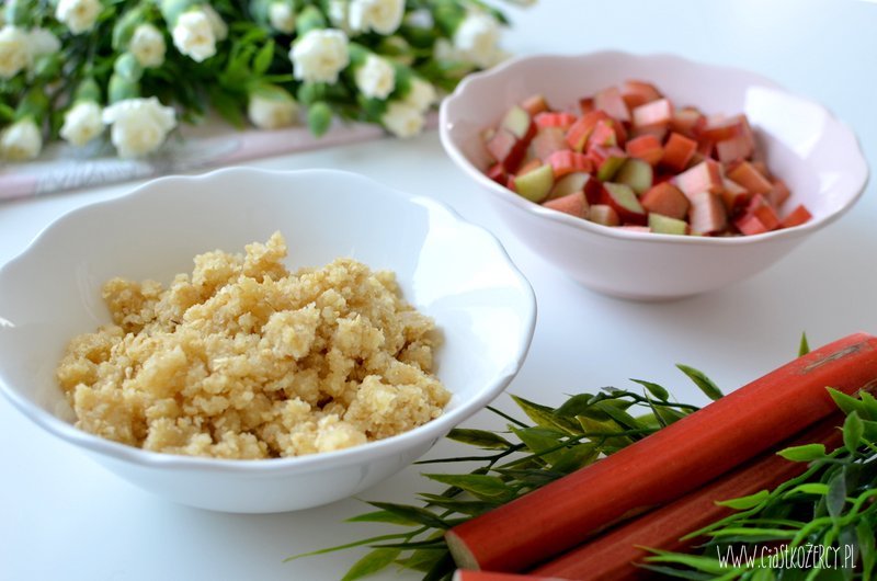Rabarbar kroimy w dużą kostkę (ok. 1,5 cm, mniejsze kawałki mogą za bardzo wysuszyć sie podczas pieczenia). Jeśli lubicie słodkie ciasta można zasypać dodatkowo pokrojony rabarbar 1-2 łyżkami cukru.