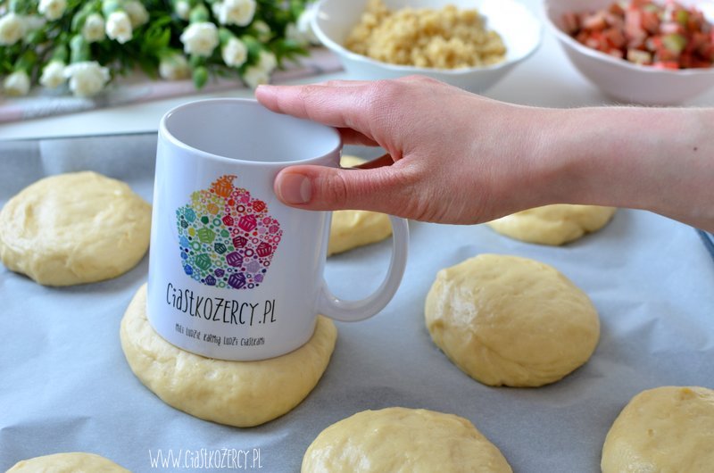 W każdej drożdżówce robimy wgłębienie dnem kubka (żeby nie przyklejał się do ciasta można zanurzyć go w mące).