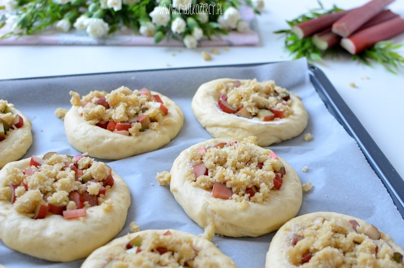Drożdżówki posypujemy rabarbarem i kruszonką. Uformowane Drożdżówki z rabarbarem pieczemy w piekarniku rozgrzanym na 180 stopni przez 20-25 minut.