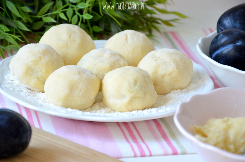 Oprószamy dłonie mąką, urywamy kawałek ciasta, spłaszczamy go lekko w rękach i na środek dajemy kawałek śliwki. Zagniatamy ciasto w kulkę, uważając, żeby z żadnej strony nie wystawała śliwka. W razie potrzeby podczas lepienia podsypujemy knedle mąką. Ulepione knedle przekładamy na talerz lub stolnice oprószoną mąką.