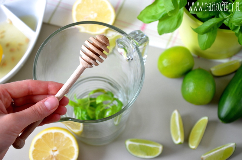 Do dzbanka wkładamy świeżą bazylię, brązowy cukier i nieco soku z cytryny. Całość ugniatamy drewnianą łyżką (lub innym drewnianym przyrządem kuchennym :) ) – listki bazylii muszą puścić sok, a cukier ma rozpuścić się w soku z cytryny.