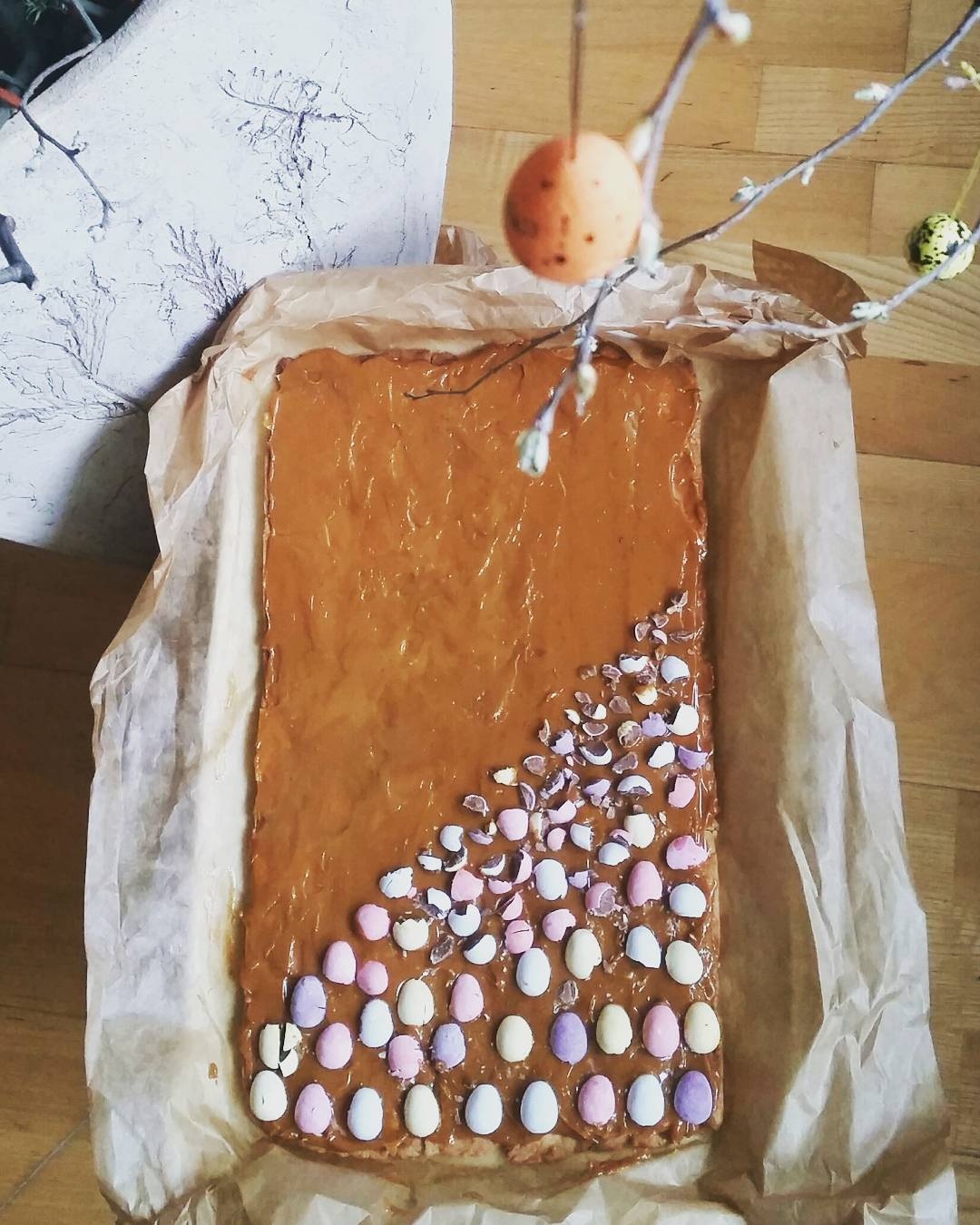 Po prostu masa kajmakowa udekorowana czekoladowymi jajeczkami :) Męska część mojej rodziny (tato i bracia) uwielbiają „słodkie słodkości”, tak więc połączenie kajmaku z niewielką ilością czekolady w ich przypadku nie jest przesadą :D