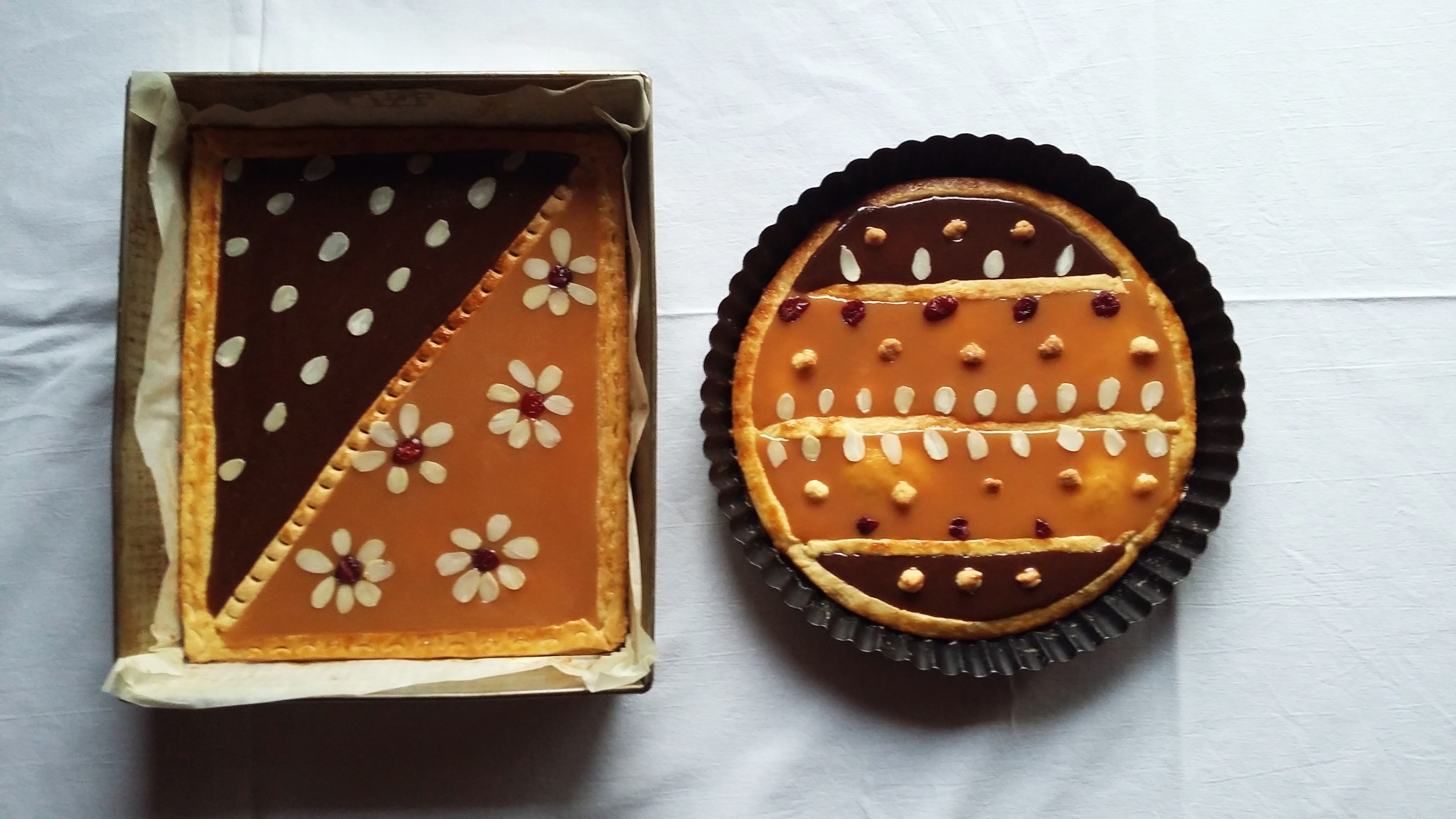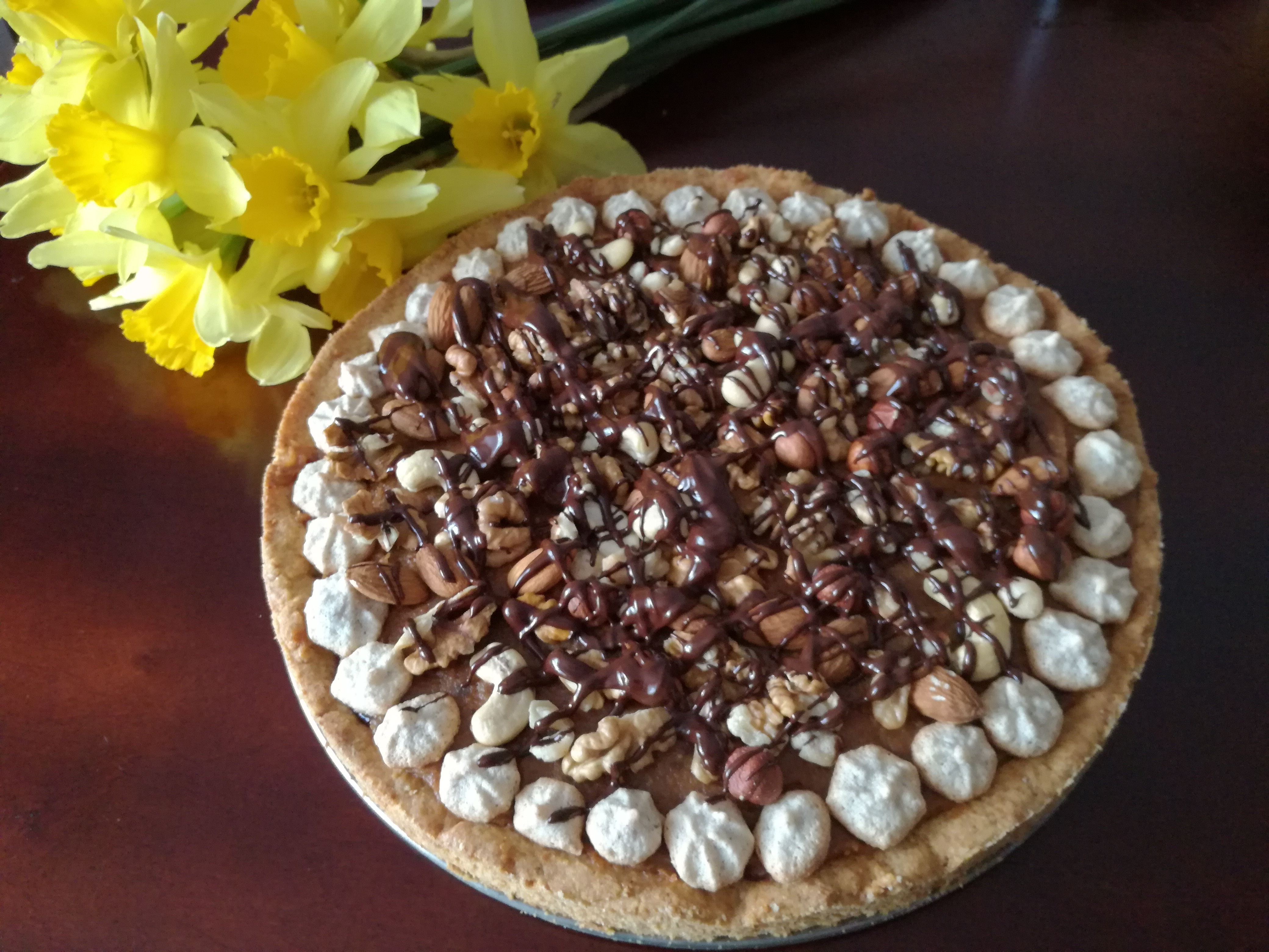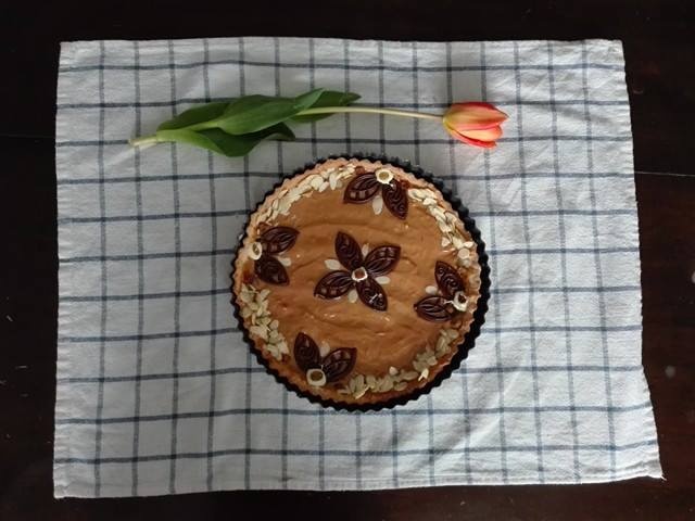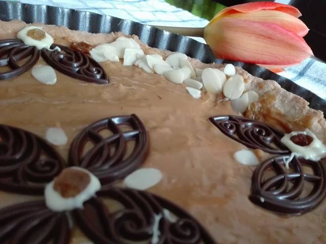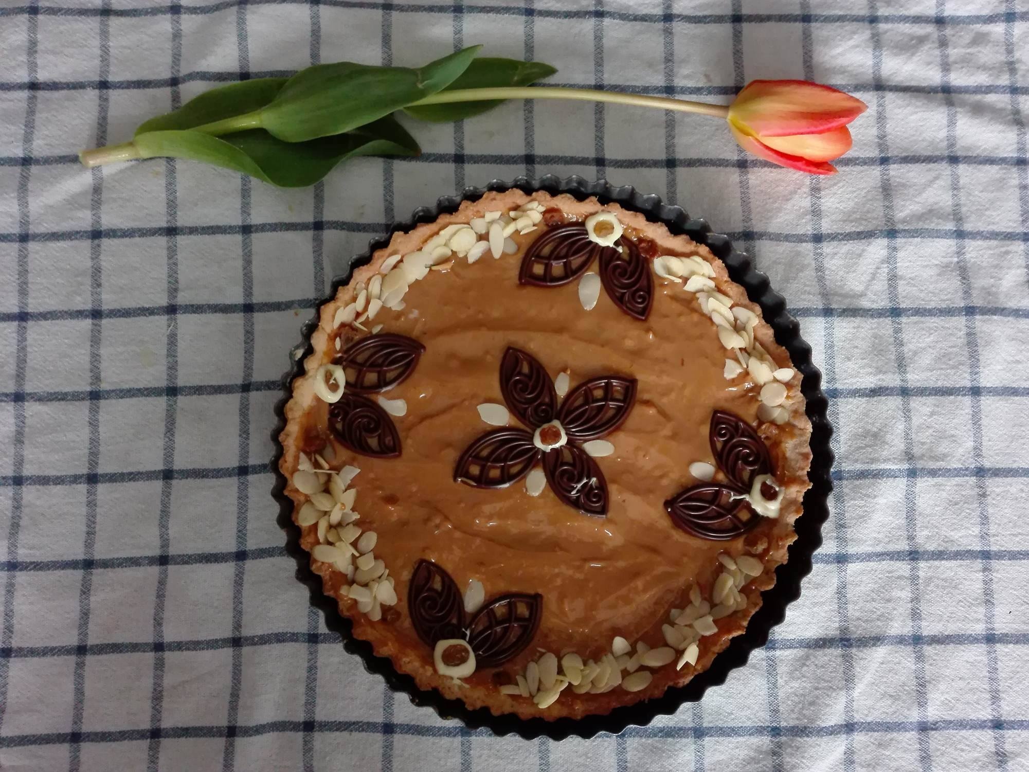 Na upieczoną tartę wylewamy połowę kajmaku i rozsmarowujemy. Dekorujemy bakaliami (ja dodatkowo uprażyłam orzechy laskowe na suchej patelni).