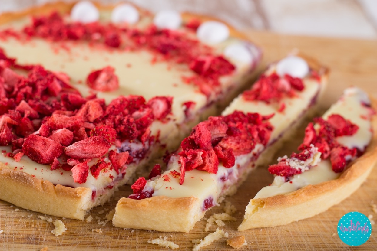 3. Na kruchym i wystudzonym spodzie rozprowadzić równo dżem malinowy. Na wierzch wylać wciąż lekko ciepłą polewę z białej czekolady, wyrównać. Posypać posiekanymi owocami liofilizowanymi, odstawić do stężenia (najszybciej w lodówce).