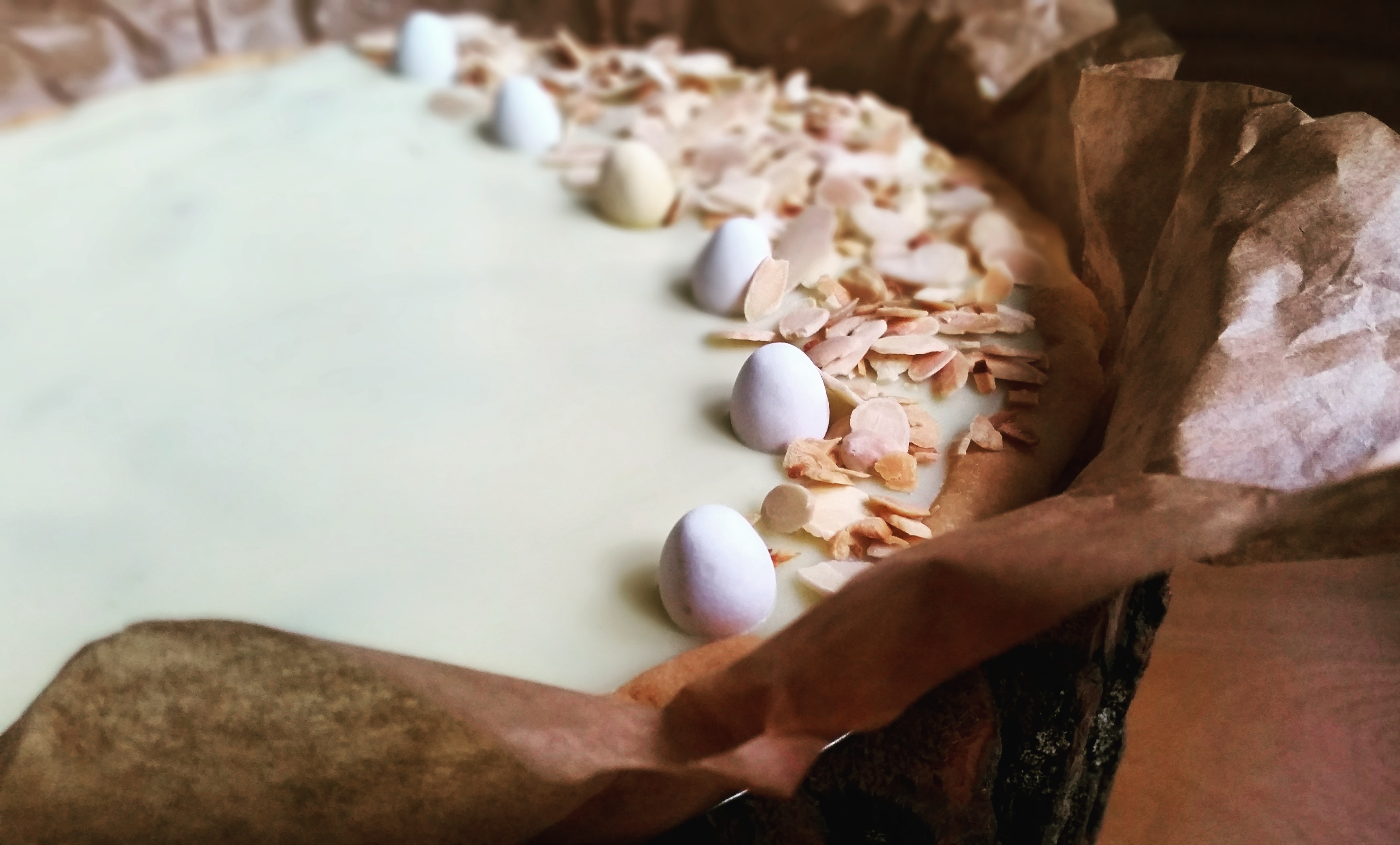 W garnuszku pogrzać do wrzenia śmietanę, zdjąć z palnika. Dodać połamaną w kostki białą czekoladę, rozpuścić i dobrze wymieszać. Ostudzoną białą masę wylać na dżem. Wstawić do lodówki. Kiedy czekolada zastygnie udekorować uprzednio prażonymi migdałami oraz czekoladowymi jajeczkami.