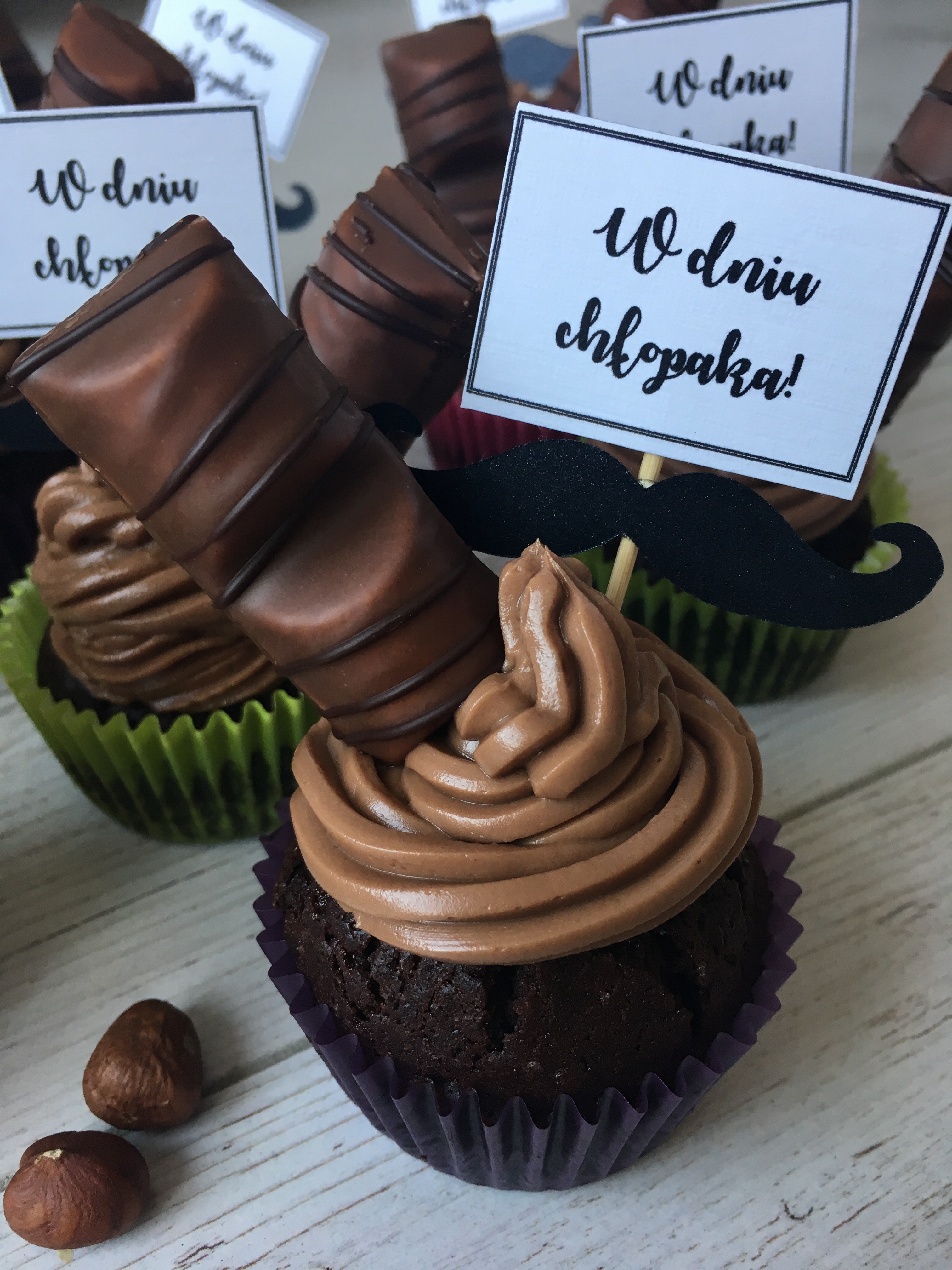 Gotowe babeczki dekorujemy kawałkami batoników – pojedyncza kostka trzyma się bez problemu na kremie, jeśli zdecydujemy się na podwójną (opcja jak na zdjęciach) w babeczkę trzeba wbić wykałaczkę a na nią włożyć połówkę batonika. Nie ma obawy, że nasi goście zrobią sobie krzywdę wykałaczką – kiedy ściągną batonik będzie ją dobrze widać.