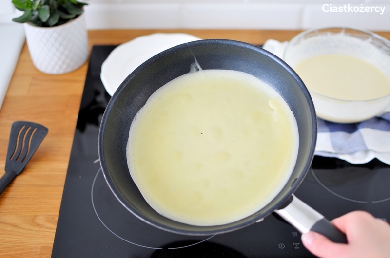 Zaczynamy smażenie. Pierwszy naleśnik wcale nie musi być na straty :) Patelnie należy wcześniej dobrze rozgrzać, najlepiej na średnim poziomie płyty (u mnie to 4 na 9 możliwych). Dzięki dodatkowi oleju lub masła do ciasta, patelni nie trzeba dodatkowo smarować żadnym tłuszczem. Warto natomiast wybrać do smażenia taką, z nieprzywierającą powłoką. Podczas wlewania ciasta patelnię najlepiej trzymać w ręku nad płytą. Po wlaniu niewielkiej chochelki ciasta przechylamy patelnię na boki, żeby dokładnie rozprowadzić je po całej powierzchni. Naleśniki smażymy ok. 30-40 sekund, przewracamy kiedy całe ciasto się zetnie. Smażenie na drugiej stronie trwa krócej niż na pierwszej.