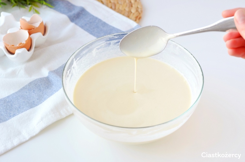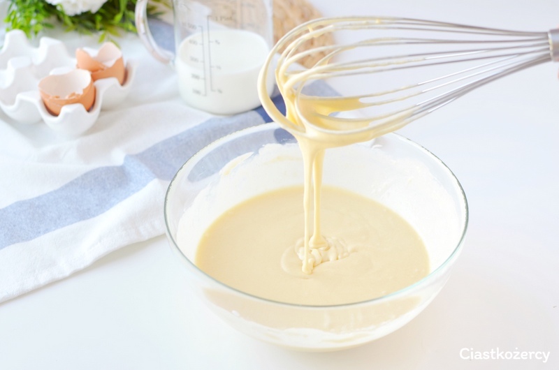 Kiedy w cieście nie ma już grudek dodajemy mleko i jeszcze raz mieszamy. Jeśli zdecydujemy się na mikser trzeba upewnić się wcześniej, że miska jest odpowiednio wysoka, inaczej ciasto może nam się wychlapać podczas miksowania. Gotowe ciasto naleśnikowe może wydawać się za rzadkie, ale właśnie takie powinno być. Dzięki odpowiedniej konsystencji ciasta, będzie dało się je łatwo rozprowadzić na patelni, a gotowe naleśniki będą idealnie cieniutkie.