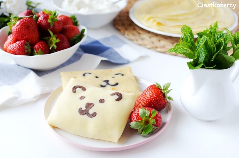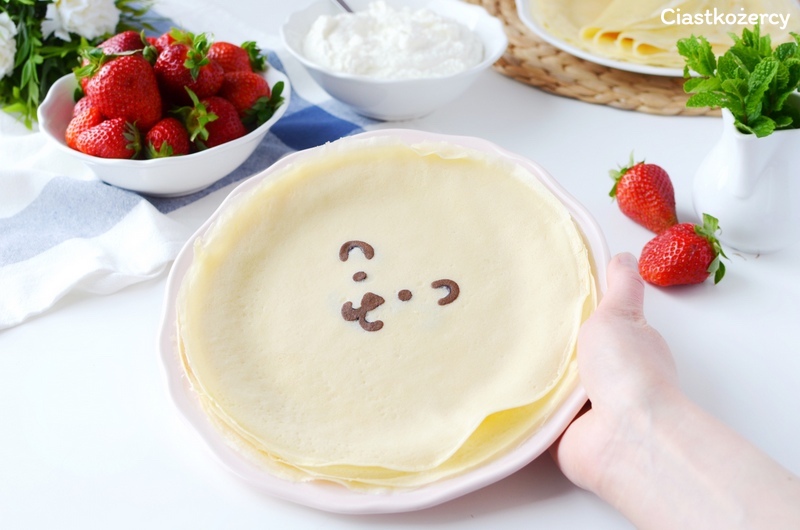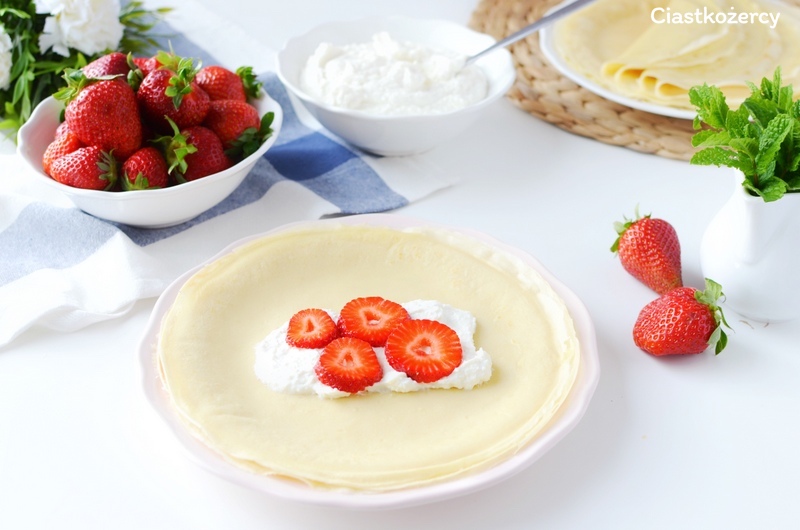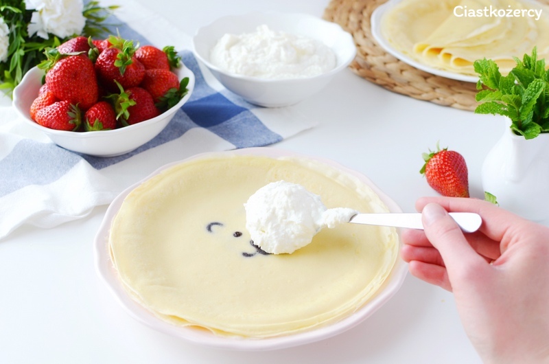 Moje dzisiejsze naleśniki podawałam ze słodkim twarożkiem i truskawkami.