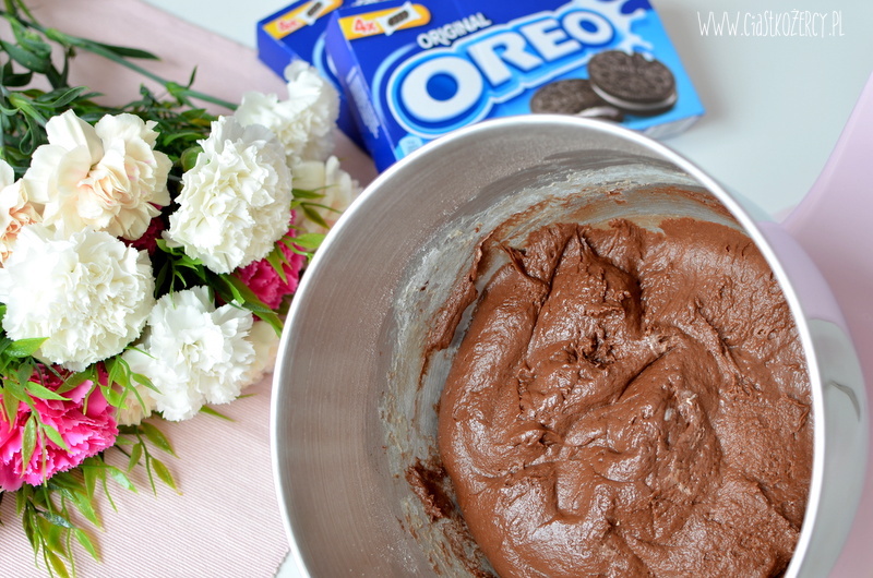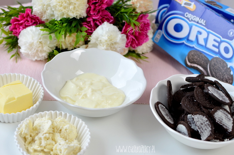 Z ciasteczek oreo wyciągamy nadzienie. Podrzewamy je na małym ogniu razem z masłem i serkiem homogenizowanym, tak długo aż polwa będzie miała jednolitą konsystencję. Ciasteczka kruszymy – z nich zrobimy posypkę.
