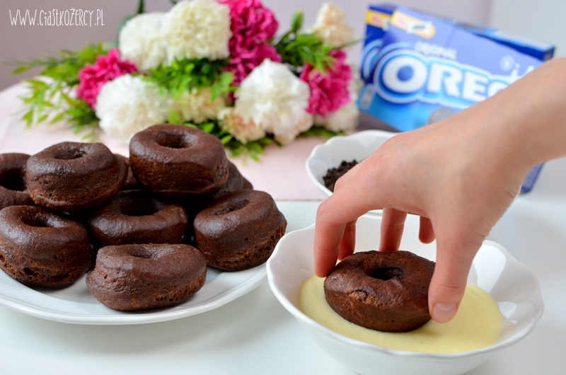 Pączki oreo maczamy w lekko przestudzonej polewie i posypujemy pokruszonymi ciasteczkami.