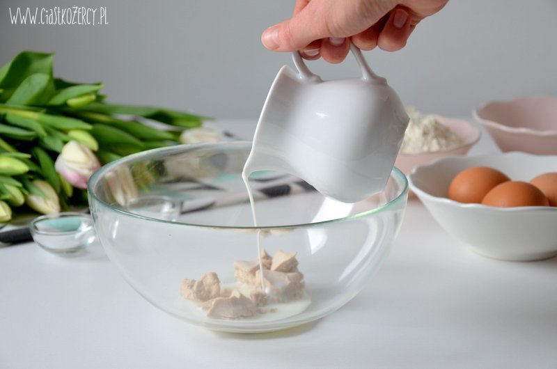 Oddzielamy żółtka od białek. Drożdże wkruszamy do ciepłego mleka, dodajemy łyżeczkę cukru, dokładnie mieszamy i odstawiamy do wyrośnięcia.