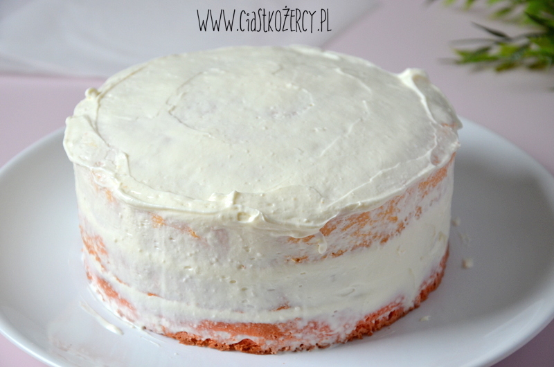 Cały tort pokrywamy cienką warstwą kremu, nie musi być równo, ważne tylko, żeby spod spodu nie wystawało ciasto.