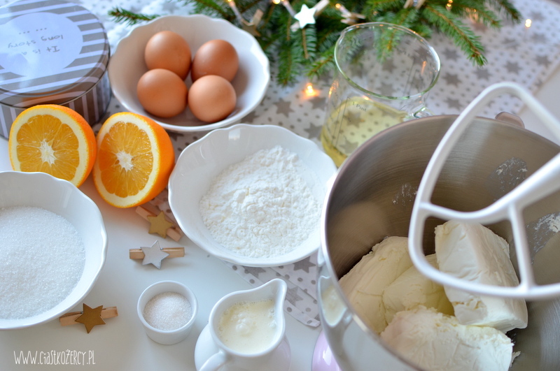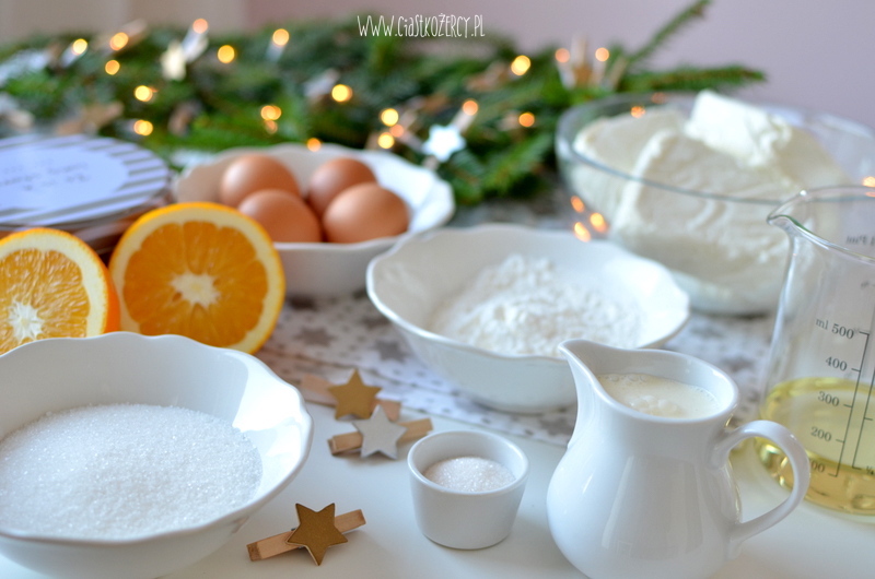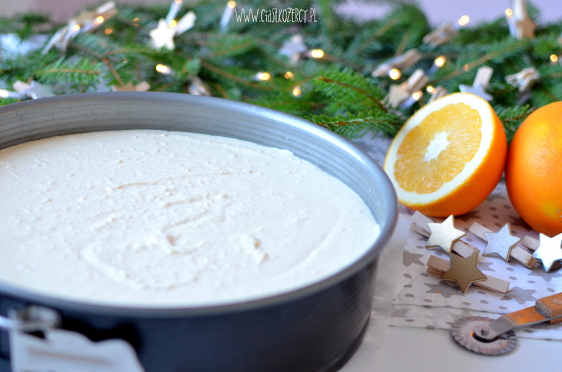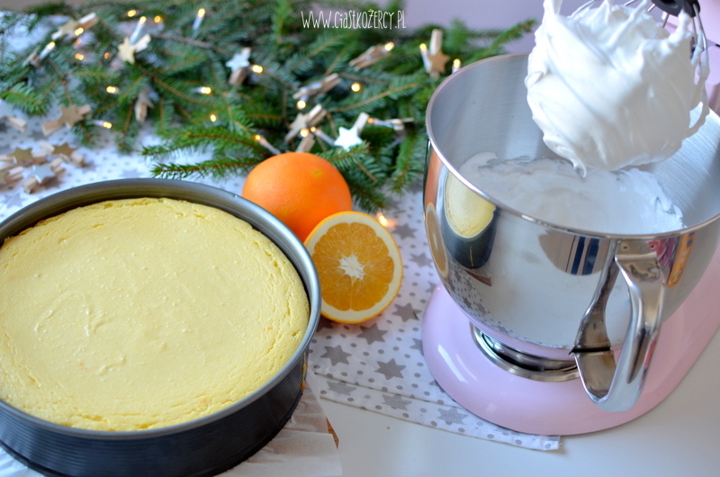Do rozmieszanego sera dodajemy wszystkie pozostałe składniki: żółtka, cukier, olej, aromat waniliowy, skórkę i sok z pomarańczy, budyń i śmietanę kremówkę. Mieszamy na najniższych obrotach miksera, masa powinna być jednolita i dobrze wymieszana, ale nie należy jej za bardzo napowietrzać (tzn. długo miksować na wysokich obrotach miksera).