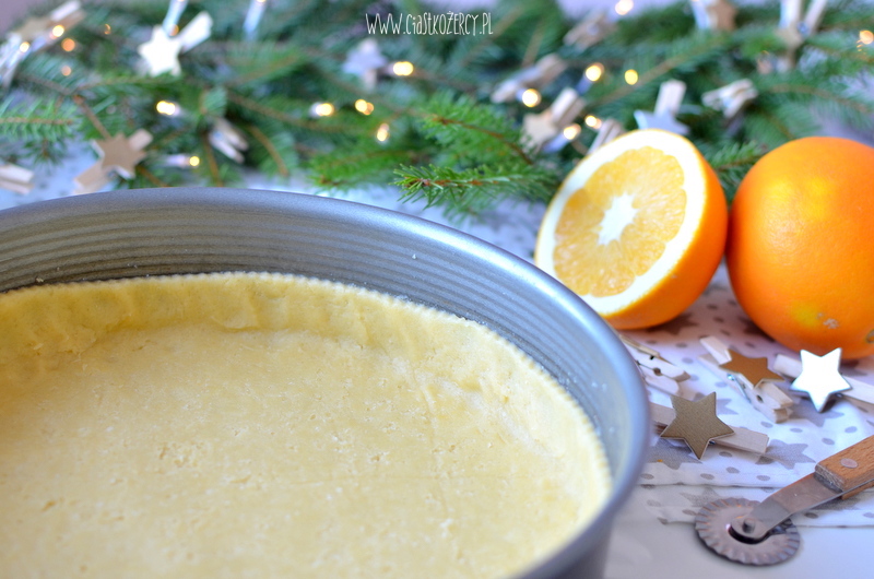 Schłodzone ciasto na kruchy spód rozwałkowujemy między dwoma arkuszami papieru do pieczenia na grubość kilku milimetrów. Wykładamy nim spód i rancik tortownicy.