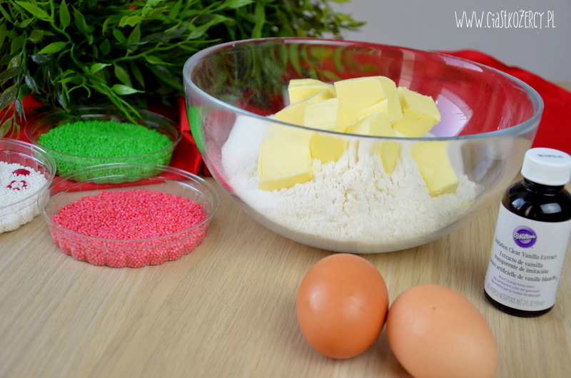 Dzisiejszy przepis to już ostatni jakim chcę podzielić się z Wam przed Świętami. Kruche ciasteczka sprawdzają się w zasadzie na każdą okazję, dziś w wersji świątecznej z cukrowymi koralikami :) Ciasteczka zrobiłam według przepisu na proste ciasteczka maślane, zamiast cukru waniliowego dałam ekstrakt z wanilii. Dodatkowo potrzebny będzie czerwony barwnik spożywczy (w żelu lub proszku – barwniki w płynie mogą za bardzo rozcieńczyć ciasto) i cukrowe koraliki.
