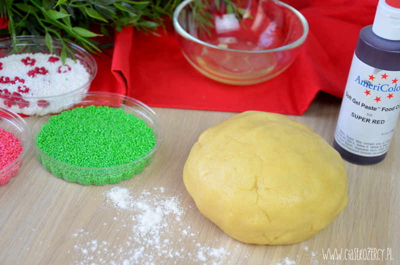 Do 1/3 ciasta dodajemy czerwony barwnik i dokładnie zagniatamy.