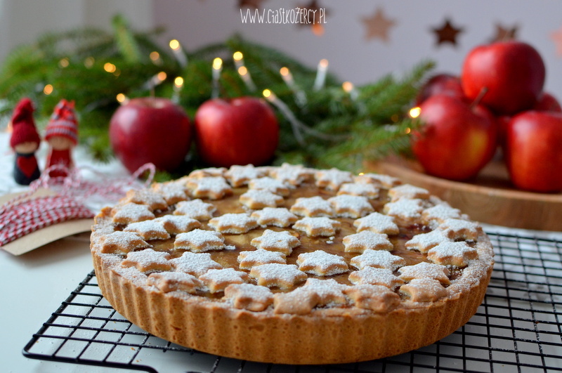 Tarta z jabłkami jest już prawie gotowa! Teraz wierzch dekorujemy gwiazdkami wyciętymi z reszty ciasta. Oczywiście, w zależności od pory roku możecie użyć dowolnych foremek, żeby stworzyć dekoracje.