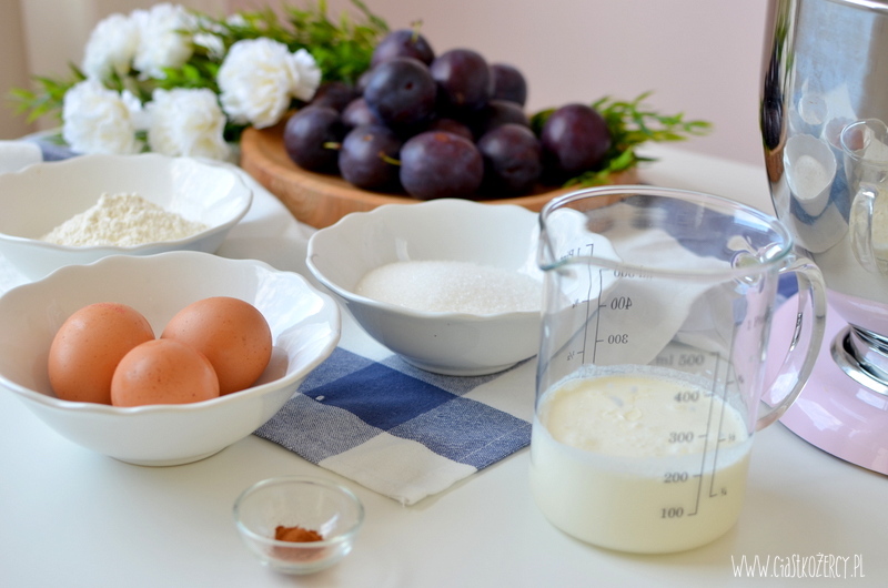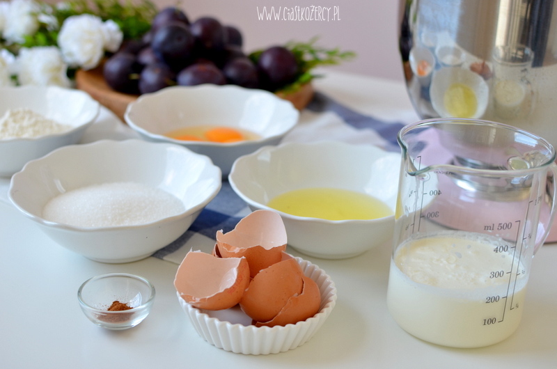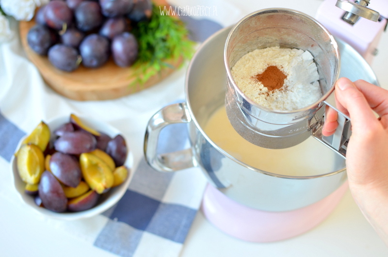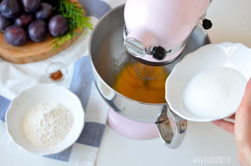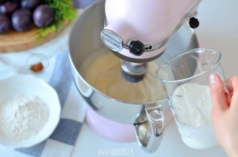 Pozostałe jajka ubijamy z cukrem, dodajemy kremówkę i przesianą mąkę z cynamonem.