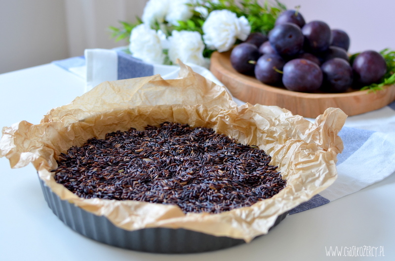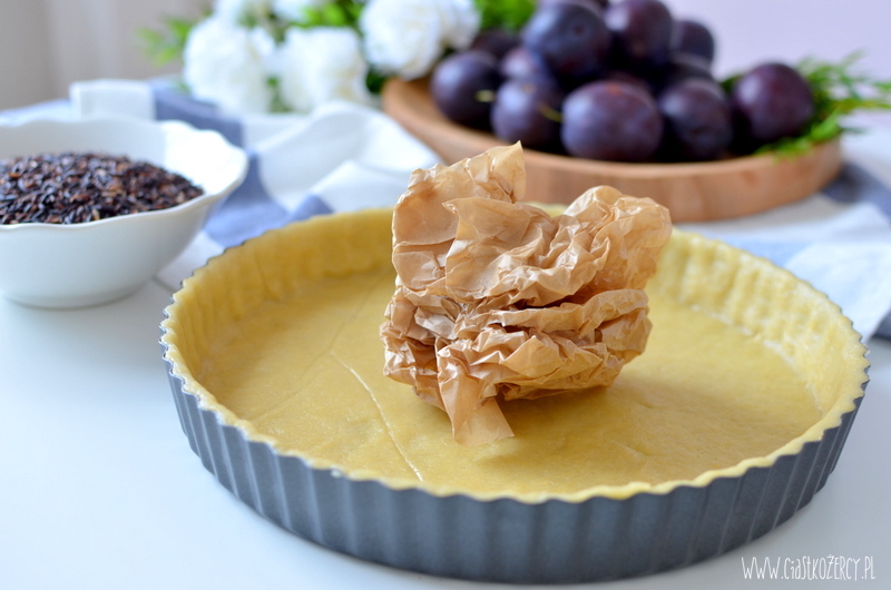 Przekładamy do formy na tartę i dociskamy do brzegów, dziurkujemy spód widelcem. Zgniatamy w kulkę kawałek papieru do pieczenia, rozkładamy na spodzie i wysypujemy warstwę ryżu – dzięki temu spód się nie wybrzuszy, ryż po pieczeniu dalej nadaje się do jedzenia.