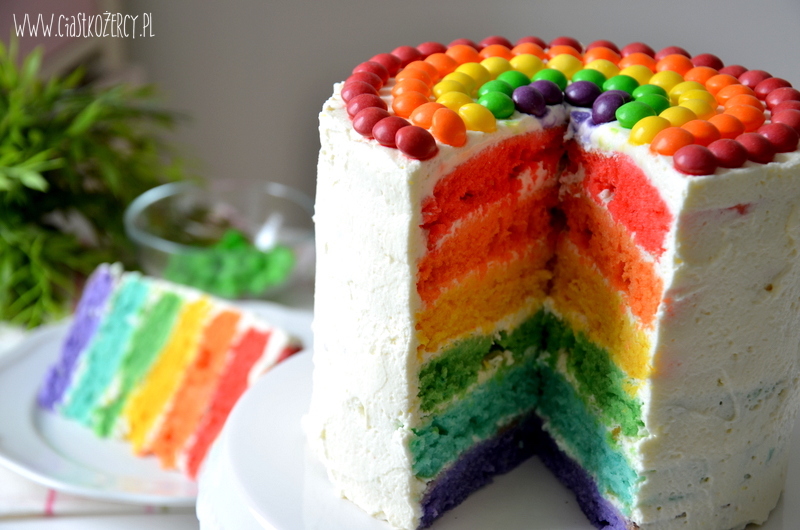 Już od dłuższego czasu chciałam zrobić tęczowy tort, idealna okazja nadarza się z powodu zbliżającego się Dnia Dziecka. Bo które dziecko nie chciałoby dostać takiego tortu? :) Jako bazy użyłam ciasta muffinkowego i jak się okazało, był to strzał w dziesiątkę. Ciasto na muffinki (przepis podstawowy znajdziecie tutaj) jest super szybkie i znacznie bardziej stabilne niż biszkopt, dzięki temu nawet 6 warstw ciasta poukładanych na sobie przetrwa spokojnie oczekiwanie na gości. Ciasto piekłam w niedużych tortownicach o średnicy 16 cm – w piecu na raz mieszczą mi się 3, co bardzo przyspiesza pieczenia.
