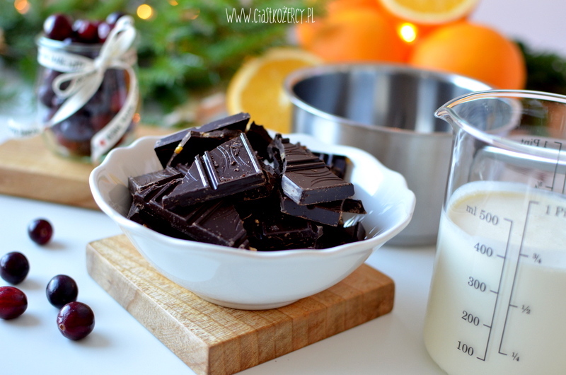 200 g gorzkiej czekolady (im większa zawartość kakao tym lepiej, ja użyłam czekolady z pomarańczą)