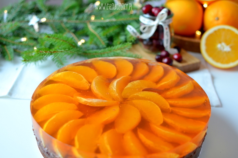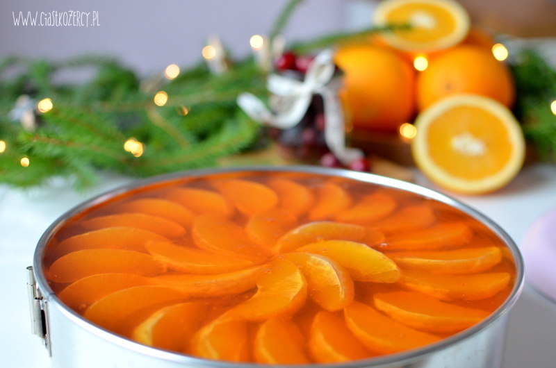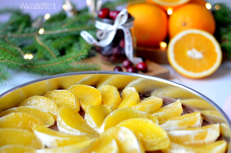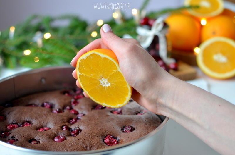 Upieczone ciasto wyciągamy z foremki, odklejamy papier do pieczenia i wkładamy z powrotem do tortownicy. Skrapiamy sokiem z pomarańczy.