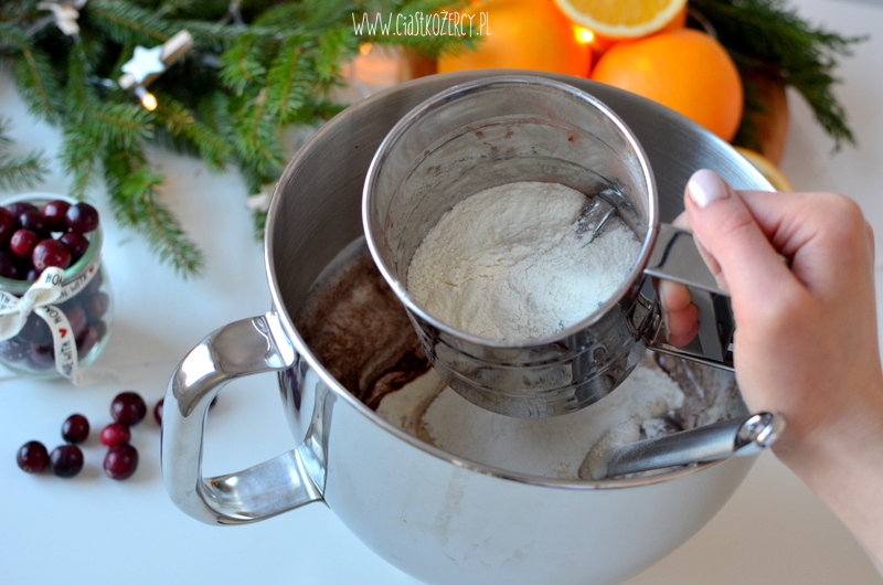 Dodajemy przesianą mąką i jeszcze raz mieszamy do połączenia składników.