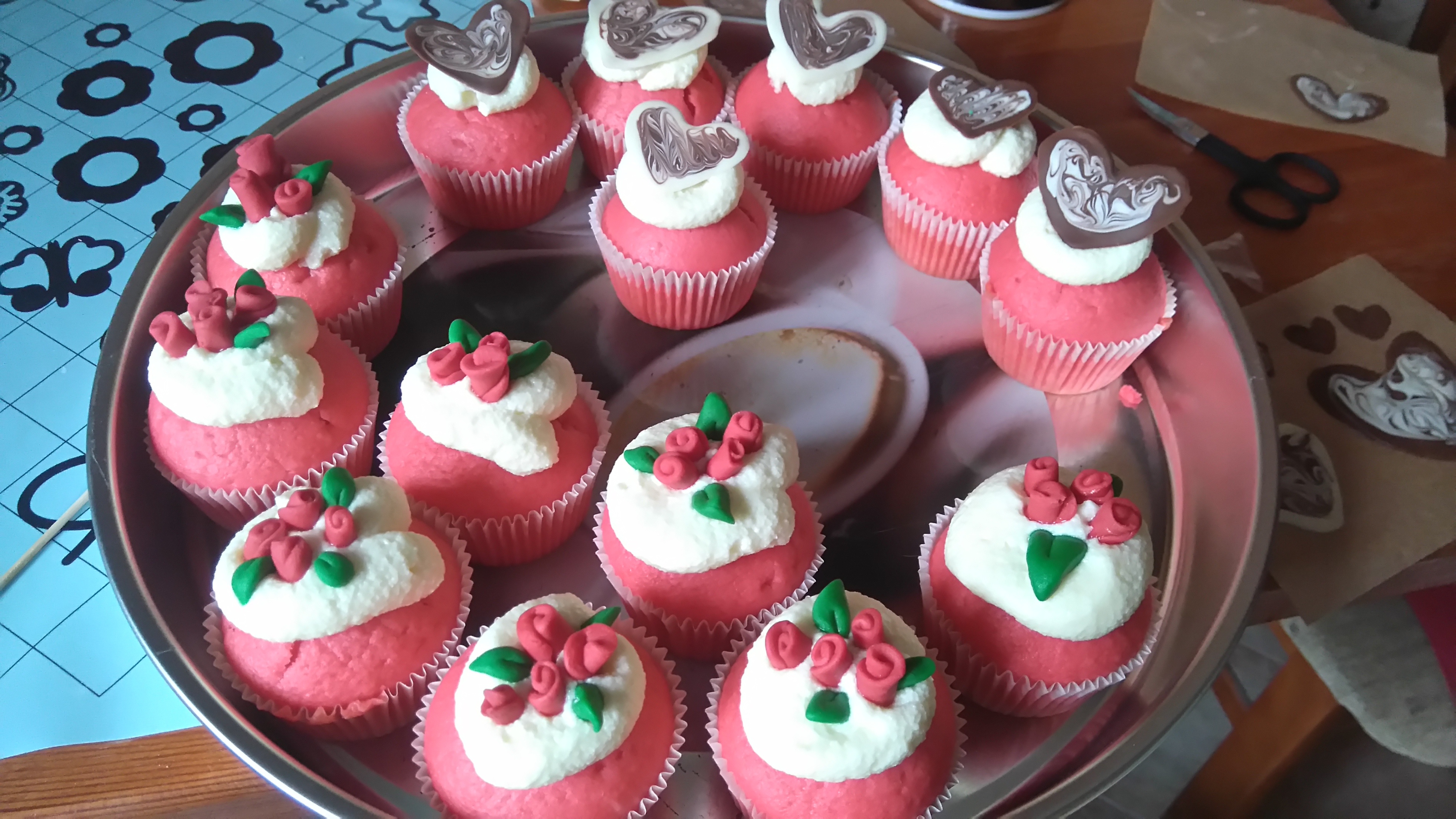 Bardzo dobre w smaku, niebanalny pomysł na prezent z okazji dzisiejszego dnia. Ja zrobiłam 2 rodzaje, do jednych włożyłam do środka kostkę czekolady, do innych zapomniałam. W efekcie część ma dekorację z masy cukrowej, a część z czekolady (oczywiście czekoladowe serduszka też robiłam sama). Udekorowałam je kremem budyniowym, bo maślany jest zbyt słodki. Niestety różyczki trochę puściły kolor :/ Ale na zdjęciu jeszcze tego nie widać :D Dziękuję za inspirację!